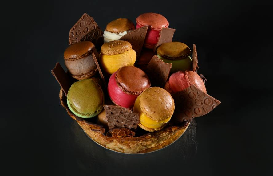 Fond de tuile aux amandes nappé de chocolat, garnis de macarons glacés.